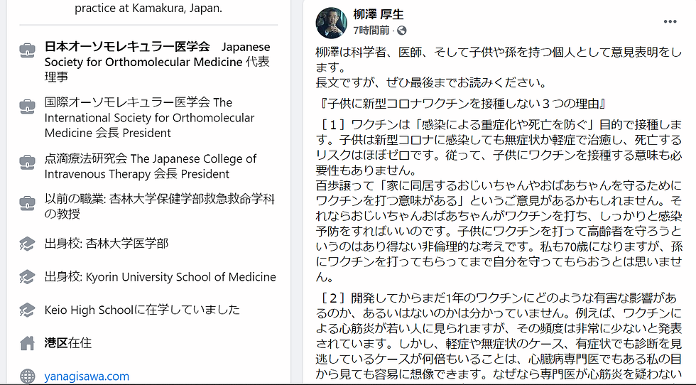 『子どもに新型コロナワクチンを接種しない3つの理由』 -柳澤 厚生先生FB