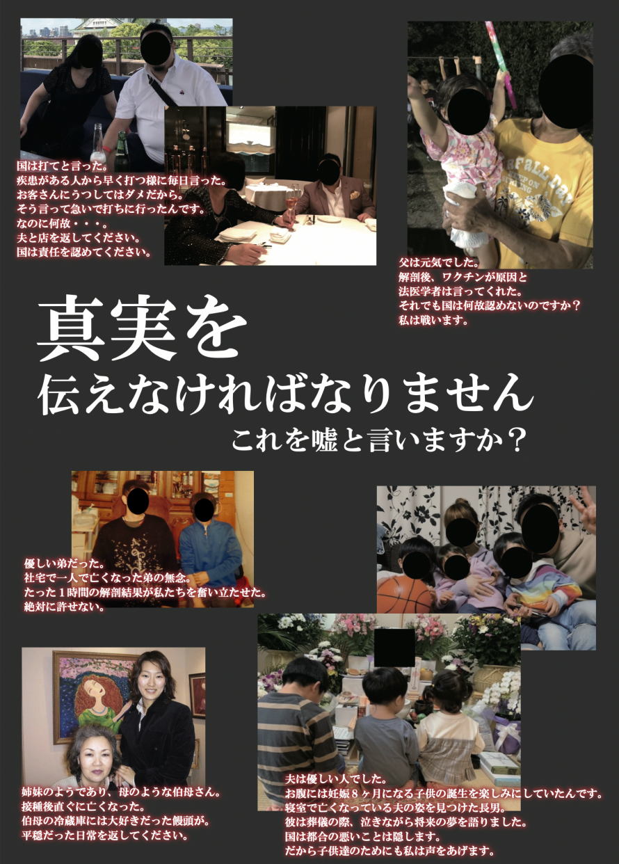 僕も、3ヵ月ほど前に初めて見ましたが、お子さん3人いらっしゃって、まだ若いお父さんが接種後に亡くなってしまったケースもあります。そのお子さんとお母さんが、お父さんの位牌に向かっている写真をみたとき、自分の中でも、何かやらなければ、、、と心が揺さぶられたのを覚えています。
